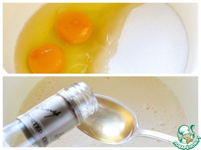 Яйца взбиваем с сахаром, ванилином. Затем добавляем размягченное или чуть растопленное масло и продолжаем взбивать. Добавляем ром.