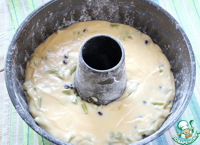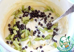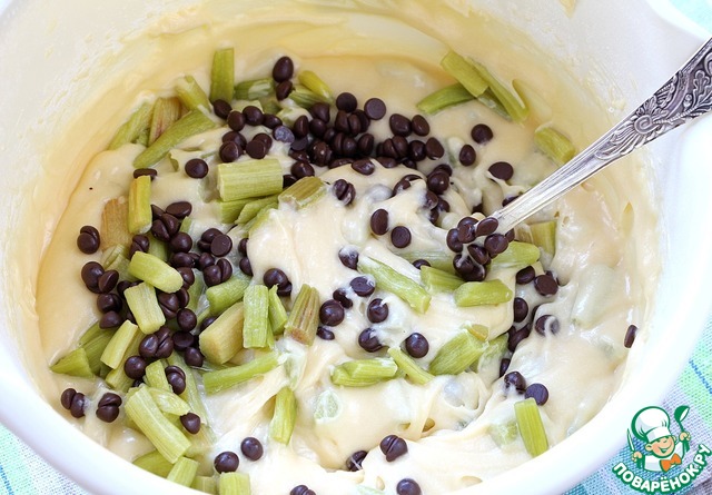 В тесто добавляем ревень и порубленные кусочки шоколада или шоколадные капли, перемешиваем.
