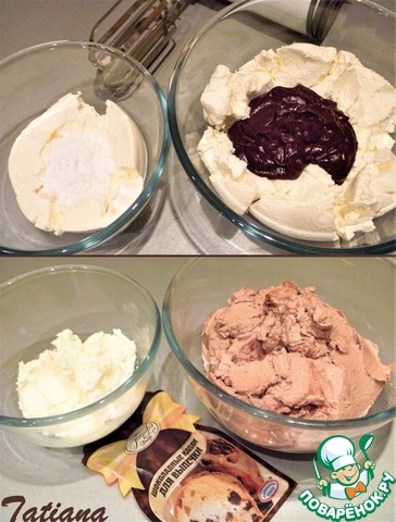 Затем (не мойте венчики миксера после взбивания сливок )смешайте миксером творог и немного остывшый шоколад.
