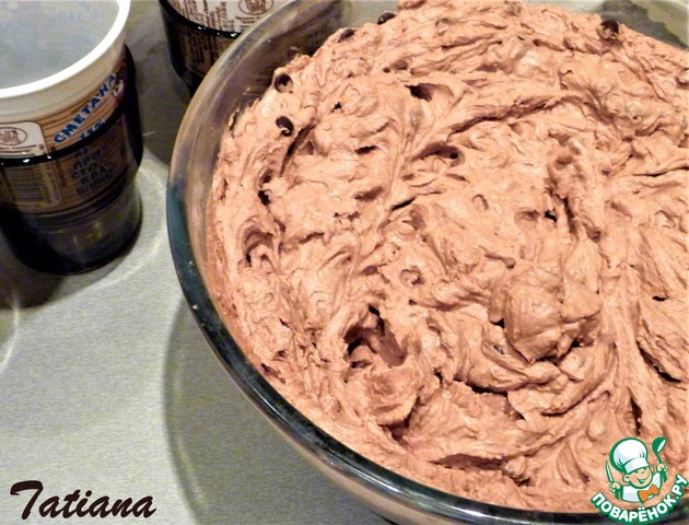 Взбитые сливки вмешайте лопаточкой в шоколадный творог, добавляя измельченный шоколад (50 г.)Я использовала термостатные шоколадные капли. -