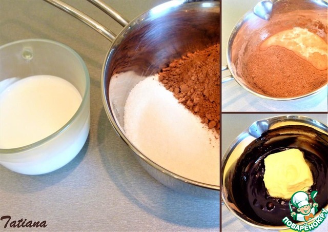 В небольшом ковше перемешайте сахар и какао-порошок, влейте холодное молоко, помешивая доведите смесь до кипения, проварите минуты 3-5, до полного растворения сахара. Вмешайте холодное сливочное масло.