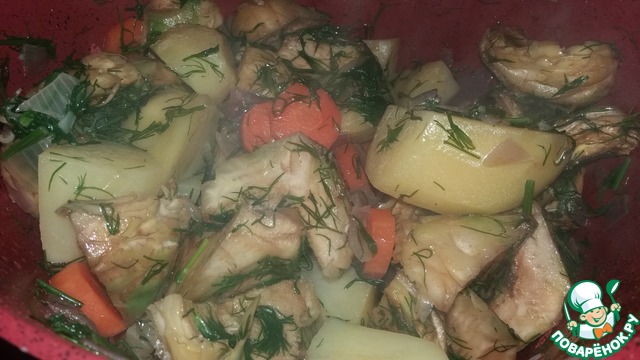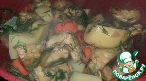 В последнюю очередь- картофель ( предварительно почистить и порезать на четвертинки), артишоки и укроп. Солим, перчим и наливаем 2 кофейные чашки горячей воды. Кастрюлю закрываем и варим на слабом огне 30-45 мин- до готовности овощей. Во время варки стараемся крышку открывать как можно реже. В конце варки вливаем лимонный сок и встряхиваем кастрюлю, чтобы сок прошел до дна.