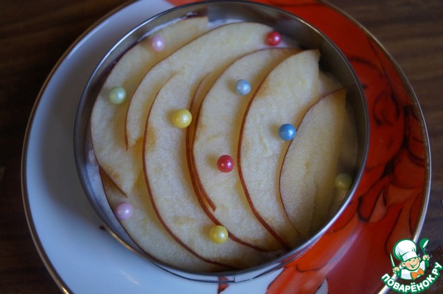 Приготовим прозрачное желе для торта от Haas, как указано на упаковке. Это очень быстро и просто. Желе практически моментально застывает, поэтому стараемся все сделать быстро. Поверх самбука укладываем яблочные слайды, украшаем декоративной посыпкой (у меня разноцветные бусинки), и заливаем прозрачным желе. Десерт убираем в холодильник минут на 20.