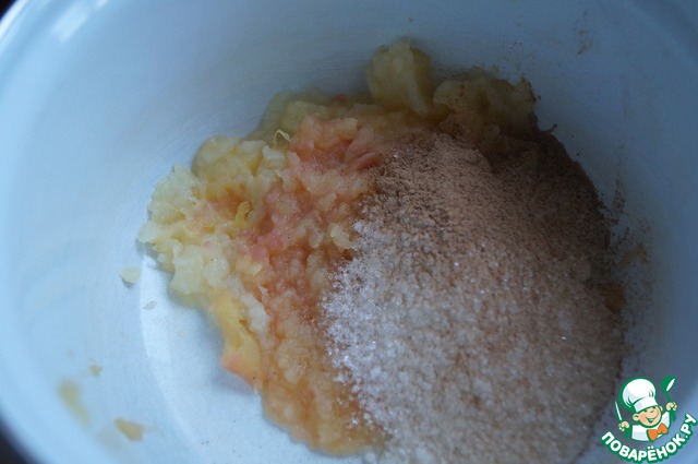 Запеченные яблоко и грушу остудить и протереть через сито, добавить сахар, корицу, лимонный сок и яичные охлажденные белки.