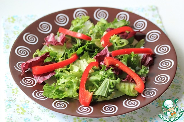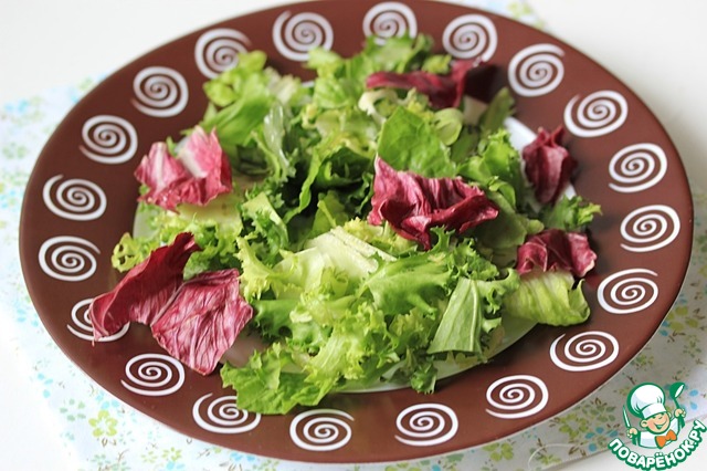 Салатную смесь вымыть, обсушить и разложить по тарелкам.