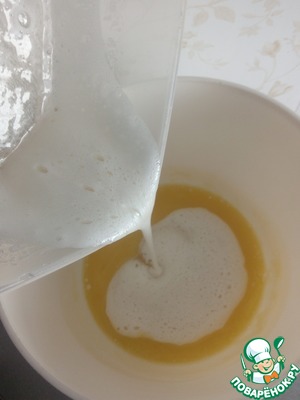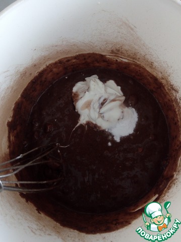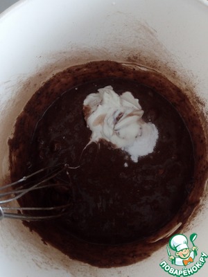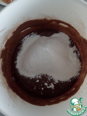 Затем вводим просеянную муку и тщательно перемешиваем.