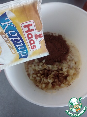 Яблоко очищаем от кожуры и режем мелким кубиком. Всыпаем корицу и какао, затем все тщательно перемешиваем.