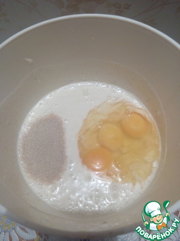 Затем ввести яйца и дрожжи, все тщательно перемешать.