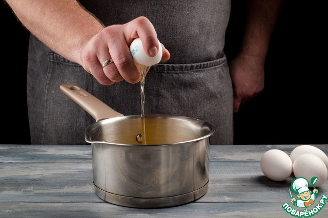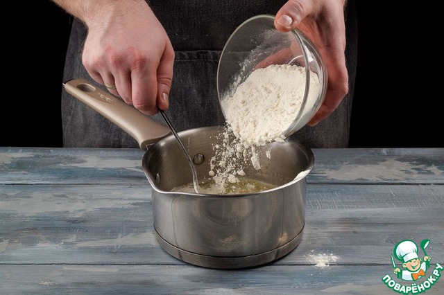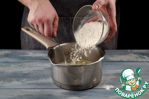 • Положите в кастрюльку масло и соль. Влейте воду. Поставьте на огонь и держите, пока масло не растает. Снимите с огня и вмешайте муку. Верните на конфорку и держите на огне, постоянно помешивая, пока тесто не станет однородным и не начнет отставать от бортиков кастрюли. Снимите с плиты.