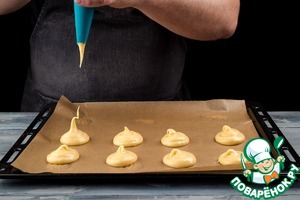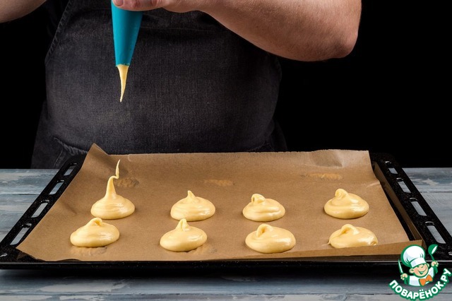 • Переложите тесто в кондитерский мешок и отсадите на застеленный пергаментом противень маленькие булочки. Ставим противень в разогретую до 200°С духовку и выпекаем профитроли до золотистой корочки, около 20 минут. Вынимаем из духовки и остужаем при комнатной температуре.