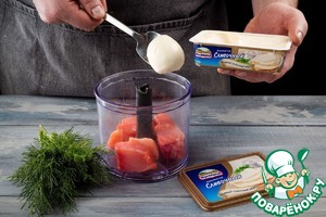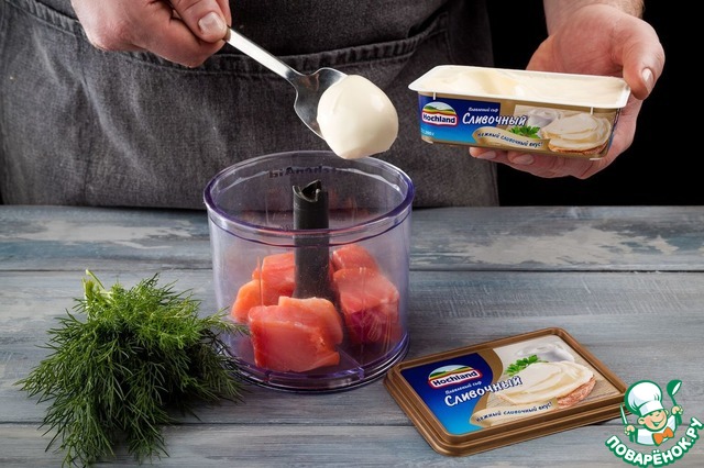 • Приготовьте начинку. Лосося нарежьте на небольшие кусочки. Плавленый сыр Hochland в ванночках Сыр смешайте вилкой с мелко нарубленным укропом. Добавьте рыбу и перемешайте все.