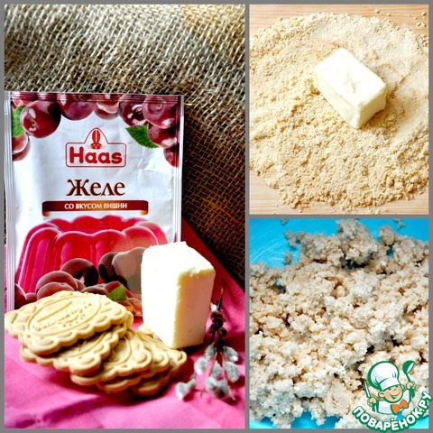 Ну а теперь осталось только собрать наше пирожное! Крошку из печенья укладываем на дно кулинарного кольца, трамбуем. Затем творожное желе. У меня оно получилось достаточно густым и поэтому ждать пока оно загустеет мне не пришлось. Ну а если творожное желе у вас получиться жидковатым, придется подержать его в холодильнике минут 30, пока оно немного схватиться. На творожное желе выкладываем немного предварительно размороженной вишни и заливам вишневым желе. Отправляем наш шедевр в холодильник на 2 часа.
