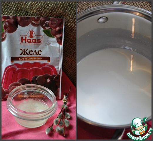 Вишневый слой готовить просто удовольствие! Весь процесс занимает от силы 1 минуту :) Смесь торговой марки "HAAS" высыпаем в миску, заливаем горячей водой, размешиваем и вуаля... желе готово!