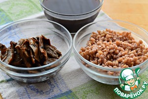 Заранее отварить перловую крупу и сушеные грибы до готовности. Грибной бульон процедить, грибы нарезать небольшими кусочками.