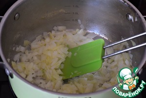 Крупную луковицу нарезать довольно мелко. Обжарить в разогретом растительном масле в глубоком сотейнике или в толстостенной кастрюле до румяности.