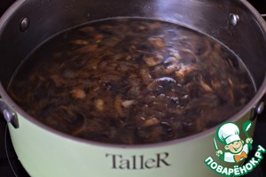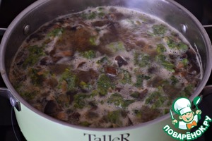 Влить в кастрюлю грибной бульон и горячую воду. Густоту супа регулировать на свое усмотрение. Довести до кипения.