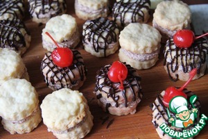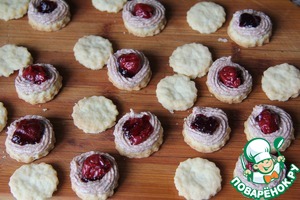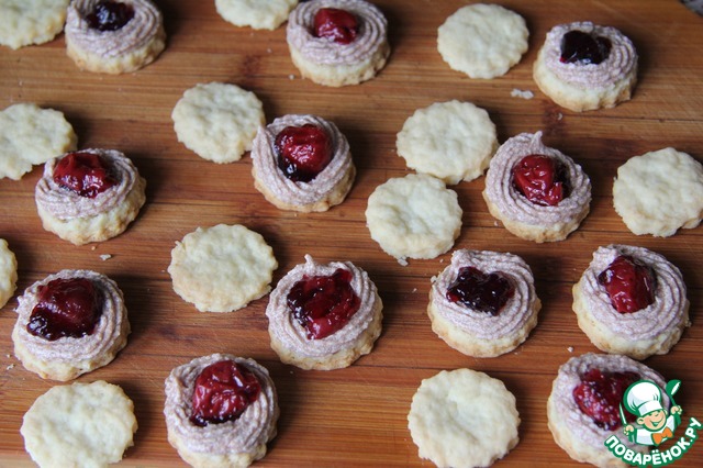 На нижнее печенье нанести крем кольцом. В середину положить вишенку (как вариант - вишневое желе/мармелад)