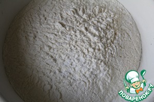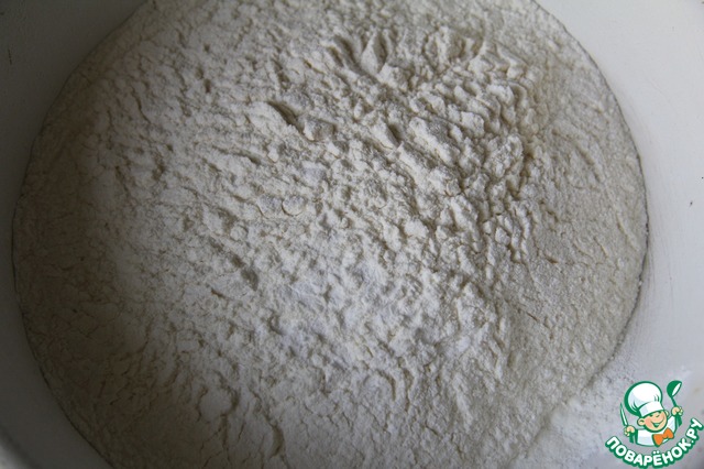 Смешать просеять в чашку муку, крахмал, разрыхлитель