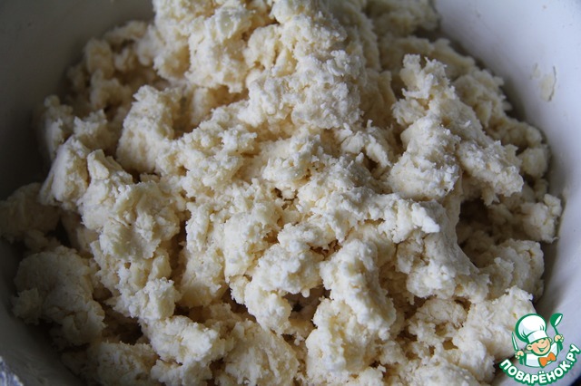 Все перетереть и добавить охлажденное сливочное масло кусочками. Долго не месить, чтобы масло не стало таять.