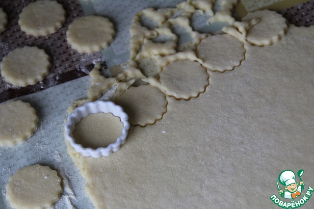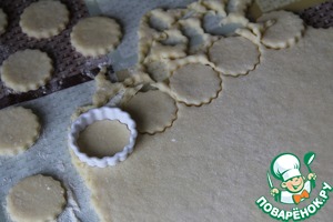 Тесто раскатывать толщиною около 4 мм. Вырезать кружки диаметром не более 5 см.