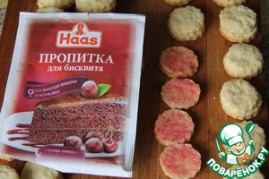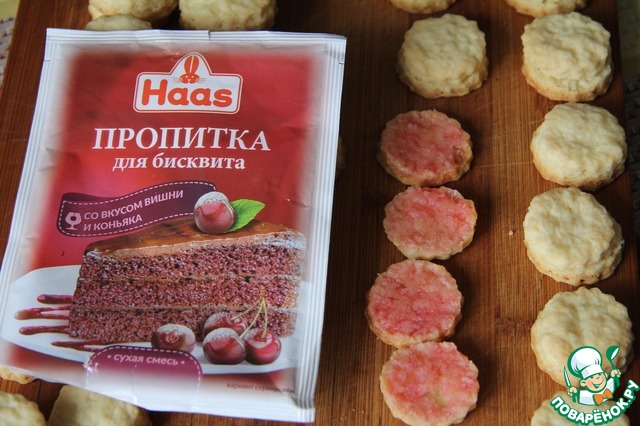 Подготовить пропитку для печений, как указано на упаковке и пропитать печенье, обмакивая его в пропитку. Можно пропитать лишь половинку печений или все - по вашему желанию и вкусу! В любом случае учитывайте, что пакет рассчитан на пропитку 2-х средних бисквитных коржей (!). Мне хватило 1/3 количества пропитки.