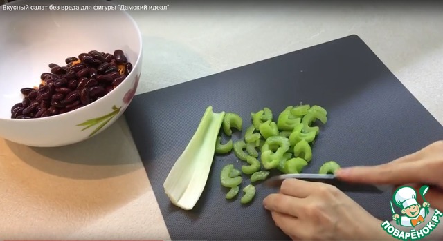 В салатник выкладываем консервированную фасоль, морковь по-корейски. Нарезаем стебли сельдерея на кусочки и отправляем его в салатник.