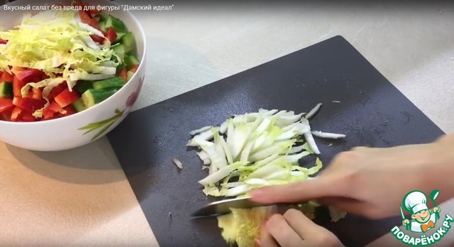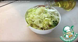 Нарезаем полосочками пекинскую капусту. 1\2 луковицы режем как можно мельче.