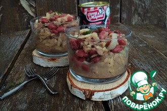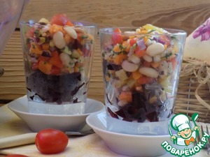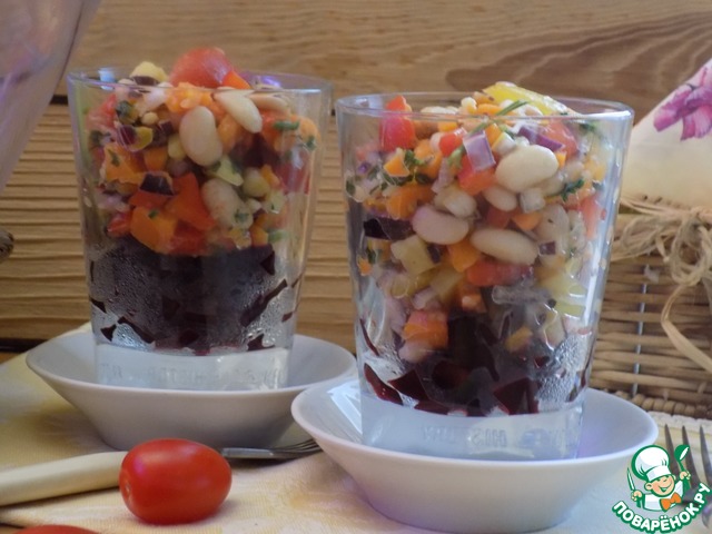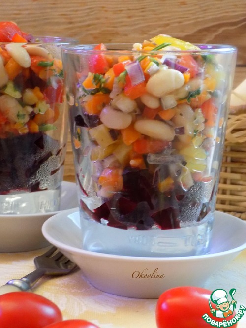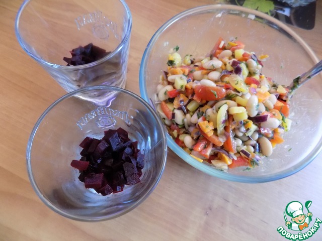 Сытный и вкусный овощной салат с белой консервированной фасолью и пикантной заправкой. Для подачи дополнила салат отварной свёклой, которую поместила на дно порционного стакана. В итоге: салат не окрасился цветом свёклы, а для тех, кто любит свёклу это отличное и полезное дополнение.