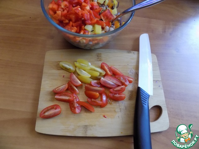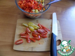 Морковь, картофель и перец болгарский нарезаем мелким кубиком. Отправляем в салатник. Помидоры-черри режем на четвертушки.