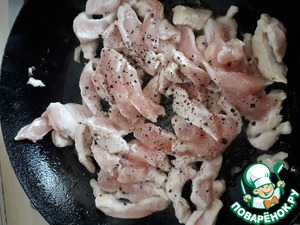 • Куриное филе нарезать соломкой, посолить, поперчить, обжарить на сильно огне на растительном масле.