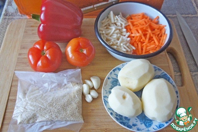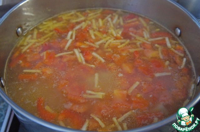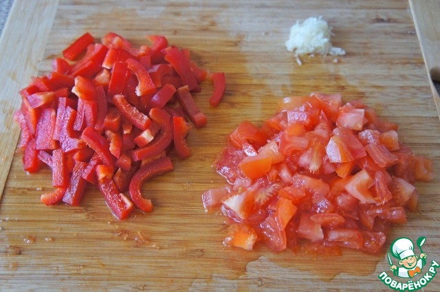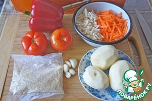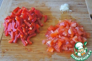 Перец нарезать полосками, помидоры - кубиками. Лук и чеснок измельчить, морковь и сельдерей нашинковать соломкой,