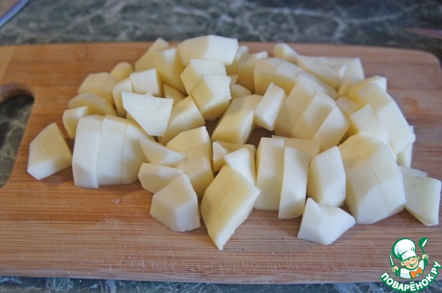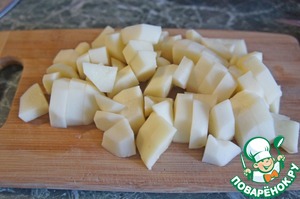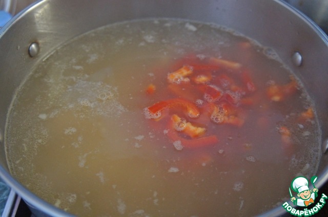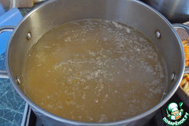 В кипящий бульон засыпать картофель, довести до кипения и варить на маленьком огне 5 минут. Всыпать промытое пшено и поварить после закипания еще 5 минут.