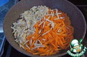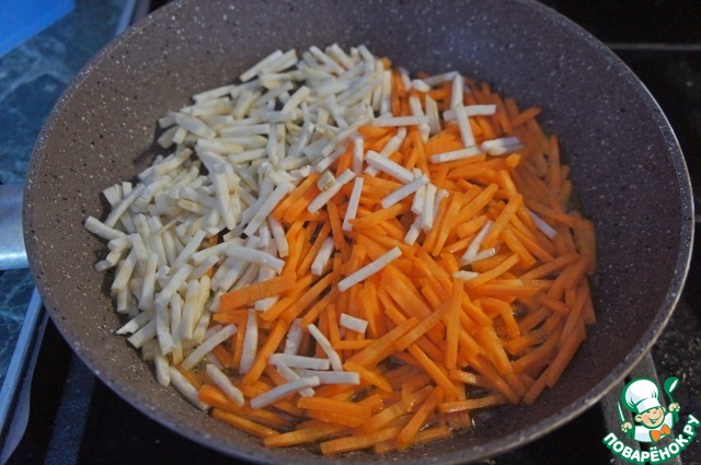 Лук, морковь и сельдерей спассеровать до мягкости.