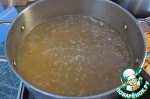 Сварить куриный бульон из любых частей курицы, мясо снять с костей, разделить на кусочки и опустить в процеженный бульон. -