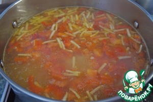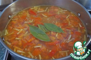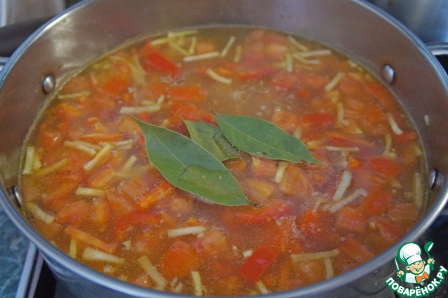 Добавить помидоры и 2-3 лавровых листика, потомить суп еще 2-3 минуты и снять с огня.