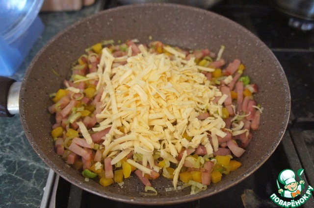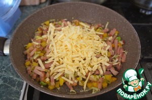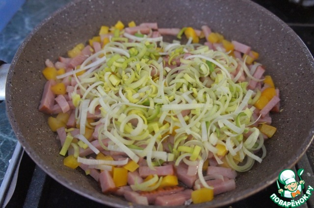 Ветчину и перец нарезать и слегка подрумянить на растительном масле.