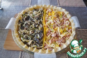 Мой зять не ест грибы. Вообще не ест, ни в каком виде. А мы собирались в лес, на лыжню. Всей семьей, внучками. А для них во всем этом мероприятии самое главное - угощение после пробежки. Без угощения-то это как! Вроде и на природе не были. Вот и пришлось мне испечь киш с двумя начинками. Одна - обжаренные с луком-пореем шампиньоны. Вторая - ветчина, болгарский перец и порей.