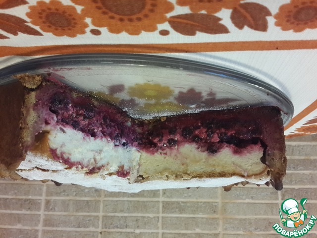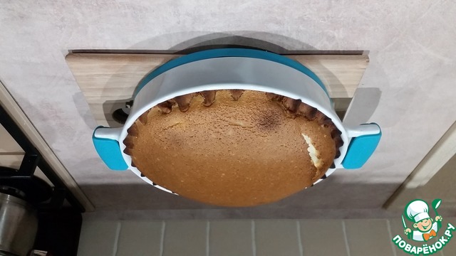 Извлечь пирог из духовки, дать ему остыть, снять бортик и убрать пирог в холодное место на несколько часов, чтобы крем мог окрепнуть.