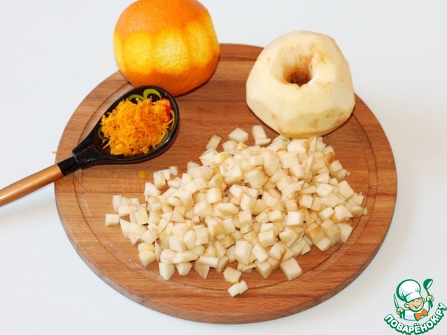 7. Подготовим начинку. Три крупных кисло-сладких яблока очищаем от семечек и шкурки и мелко нарезаем кубиками. Апельсин натираем на средней терке, нам нужно 1 ст. л. цедры. Затем выжимаем 3 ст. л. апельсинового сока.