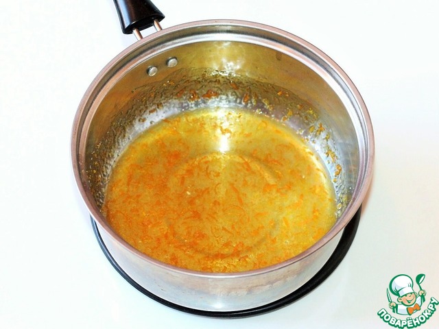 8. В кастрюле смешиваем апельсиновый сок (2 ст. л.) с сахаром (3 ст. л.) и цедрой (1 ст. л.). Ставим апельсиновую смесь на плиту и провариваем до растворения сахара. Добавляем в смесь сливочное холодное масло (20 гр), доводим его до расплавления.