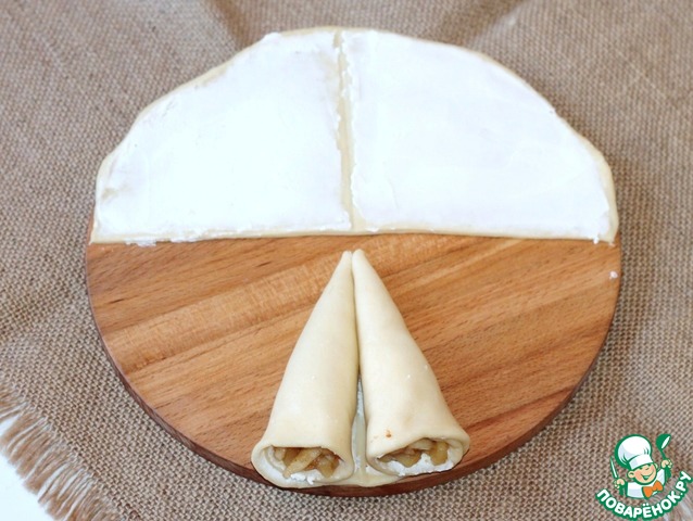 13. Разделить каждый круг пополам. В каждой половинке круга, отметить (но не резать) середину. Смазать половинки круга творожным сыром.