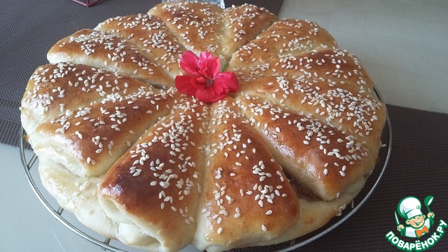 19. Затем переключаю духовку на t 180 С, достаю пирог и смазываю яичным желтком (1 шт), смешанным с молоком (1 ст. л.). Посыпаю пирог обжаренным на сухой сковороде кунжутом.