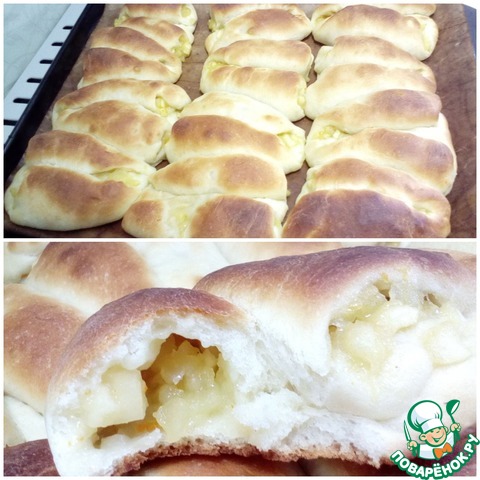 14. Кладем яблочную начинку по 1 ст. ложке с каждой стороны половинки круга.