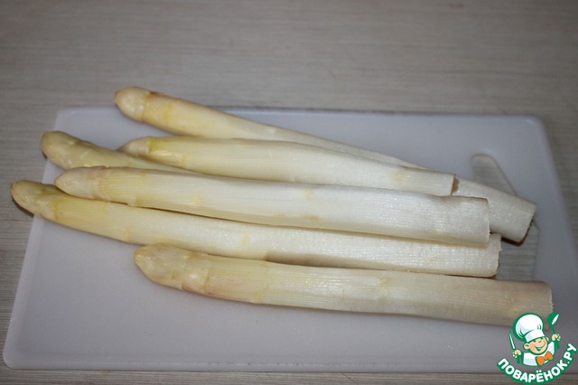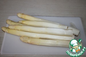 Спаржу нарезать кружочками толщиной около 0,5-1 см. Обжарить в сковороде, помешивая, 3-5 минут. Добавить нарезанный лук- порей и мелкорубленный чеснок. Жарить ещё минуту- две. -
