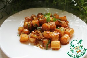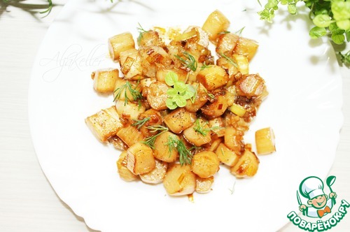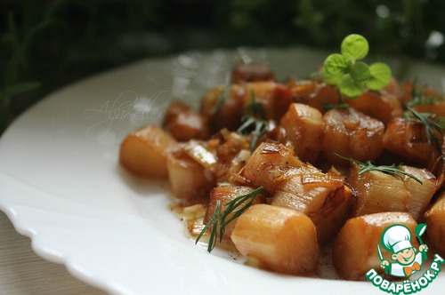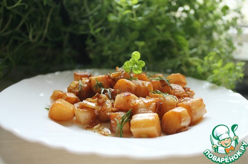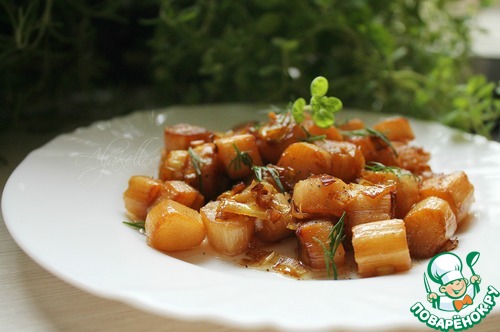 Добавить в сковороду 4 ст. л. соевого соуса, убавить огонь до самого минимума и оставить под крышкой на 10 минут (время зависит от толщины кружочков, может потребуется чуть больше времени)