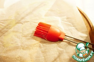 Растапливаем сливочное масло в микроволновке, духовке или на паровой бане. Растопленным маслом смазываем пергамент и оставляем буквально на минутку, чтобы масло немного "схватилось". Это нужно, чтобы к нему прилипли специи и соль.