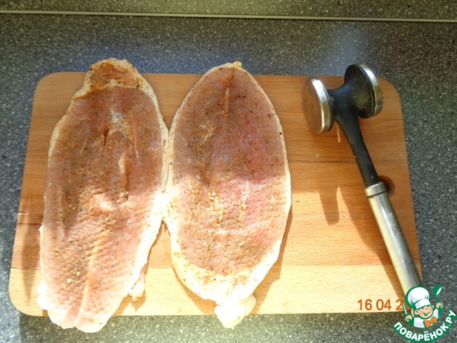 Мясо отбить и приправить специями.