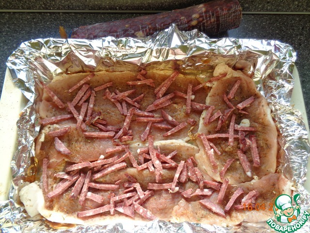По мясу разложить кусочки копченой колбасы, порезанной соломкой.