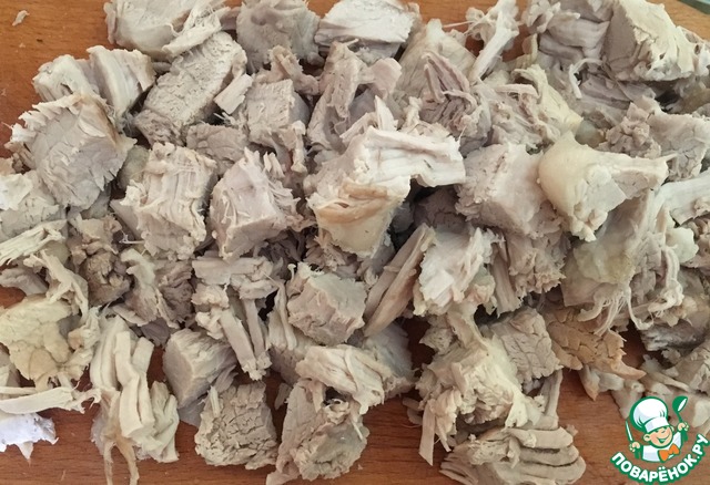 Достать из бульона мясо, по желанию бульон можно процедить. Нарезать мясо кусочками, рис промыть и отправить варится на небольшом огне. Добавить заправку и за 10 минут до выключения нарезанный чеснок.