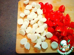 • Шарики мини моцареллы разрезаем пополам или нарезаем крупный кусок моцареллы для размера канапе.